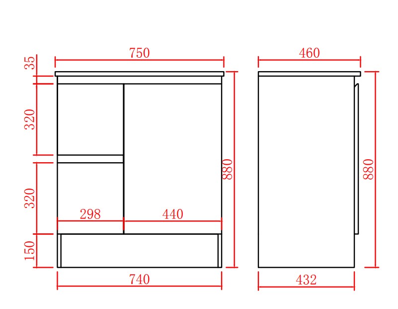 Alpha Free Standing Vanity with soft closing finger pull door and left-hand drawers Size:740*455*860mm Gloss White On Kickboards