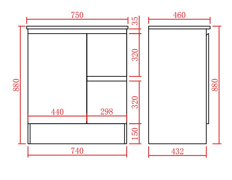 Alpha Free Standing Vanity with soft closing finger pull door and right-hand drawers Size:740*455*860mm Gloss White On Kickboards